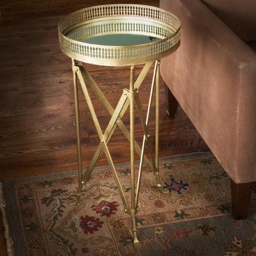 o1176187001 Inspired by the timeless accordion table, this table can function in any environment. A mirrored top creates a bit of sparkle while the brass finish makes a warm tone. Story Behind the Art: This item was made in the deserts of northern India by artisans that for generations worked within the British military establishment. Since the departure of the British in 1947, this region's industry has grown from one of military support to that of world class handicraft and furniture. These are from a family of iron workers who have been in the trade for several generations. There are three brothers that operate this family business now. Their grandfather even helped manufacture airplane parts in the final years of the British occupation of India. This table is fixed in place it is not adjustable. The handcrafted touch of artisan skill creates variations in color, size and design. If buying two of the same item, slight differences should be expected. Note: Color discrepancies may occur between this product and your computer screen. Imported. Ships carbon neutral. Features: -Brass finish. -Iron construction.