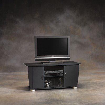- Adjustable shelf holds audio/video equipment behind safety-tempered glass doors