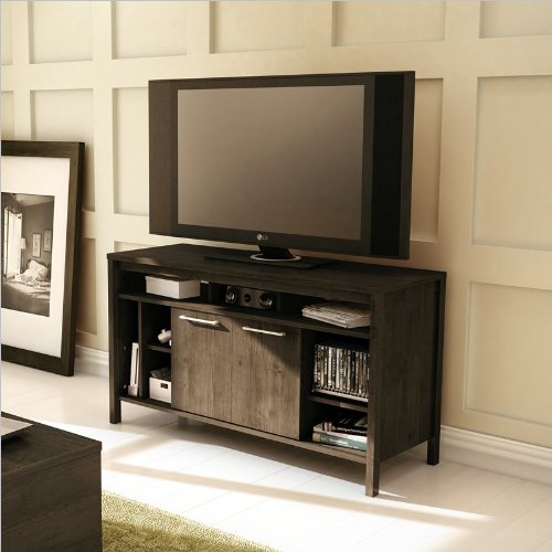 The Spirit practical TV stand in Ebony finish features multiple horizontal and vertical compartments for all your storage needs. It includes three open spaces in the top section and three more in the center for electronic devices, two sliding doors and a vertical compartment on the left hand side which is divided into three sections, two of which are separated by an adjustable shelf, a perfect spot for vertical video game consoles, CDs and DVDs. In addition, the clean lines and side moldings give the piece a refined, contemporary look. For complete interior dimensions, please see spec sheet. It is completed by a end table and coffee table of the same collection sold separately, to form a superb living room. It can accommodate a TV of up to 50 inch, its weight capacity is 185 pounds and the back is not laminated. Made of recycled CARB compliant laminated particle panels. Complete assembly required by 2 adults. Tools are not included. 5 year limited warranty. Made in Canada.